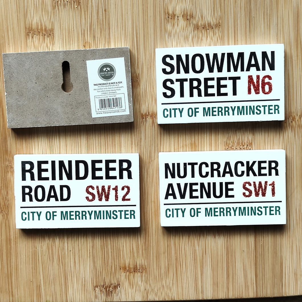 Four different glittery road signs from the City of Merryminster!  Choose from Gingerbread Gardens, Nutcracker Avenue, Snowman Street, or Reindeer Road (or go mad and order a set of all four).  The signs can be hung on a wall or door.